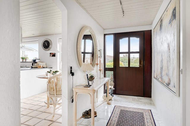 Vi inviterer indenfor til 180 velindrettede kvadratmeter. Hoveddøren åbner op til entréen, som har afsæt til de fleste af boligens rum. Her vil I bl.a. få glæde af et funktionelt køkken, der fremtræder i fin stand og er opført i kvalitetsmaterialer med dampovn og hårde hvidevarer fra Miele.
