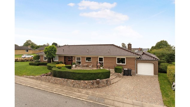 Dertil kommer et hyggeligt, flisebelagt terrassemiljø med bl.a. en anlagt, rund terrasse samt en delvist overdækket en. Sidst, men ikke mindst, er de praktiske behov på plads med garage samt udhus på matriklen.