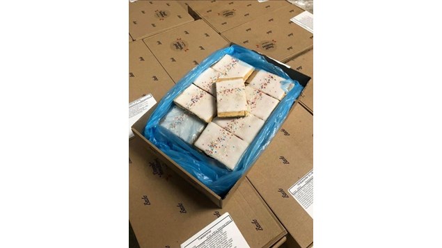 1 kasse med 32 hindbærsnitter fra Bæchs bageri i Hobro.