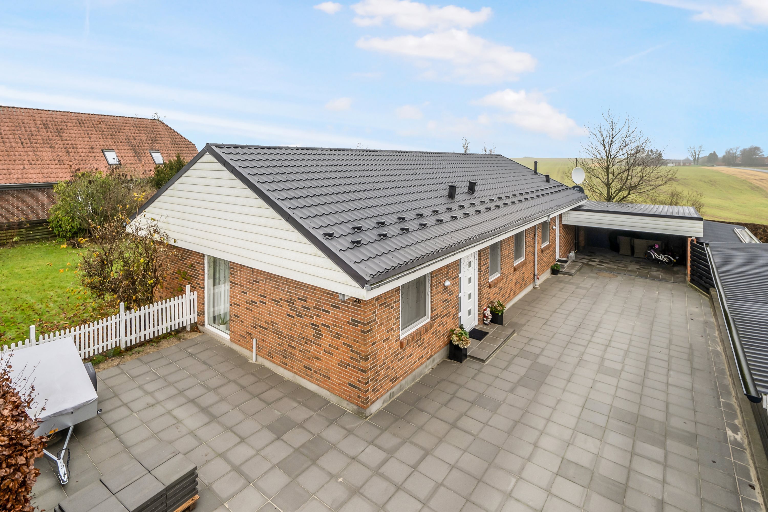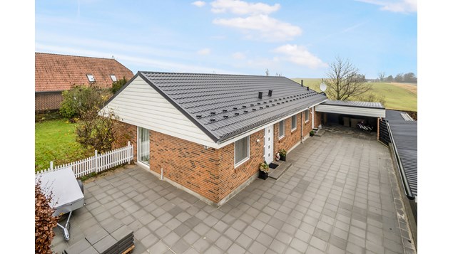 De herlige rammer fortsætter udenfor, for også haven er netop blevet opdateret, så her finder I en stor, indbydende terrasse af komposit. Herude kan I nyde de mange soltimer, børnene kan lege frit på græsset, og I kan sætte jer til rette med udsigt over markernes lange horisont.